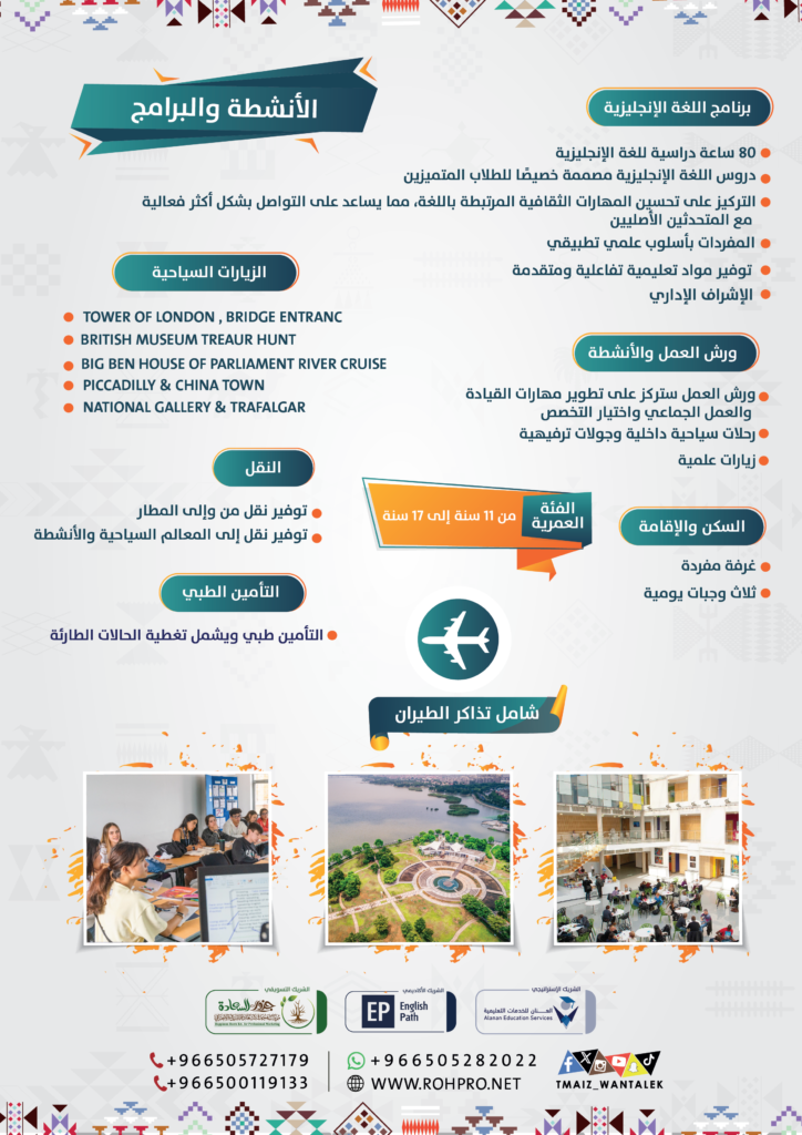 أشهر برنامج في الرحلات التربوية وتعليم اللغة الإنجليزية وتطوير المهارات القيادية منذ عام 2002م احجز الأن عن البرنامج برنامج المدرسة الصيفية فرصة ذهبية لتطوير مهارات الطلاب في اللغة الإنجليزية والاستفادة من الخبرات المتبادلة على مستوى العالم . مميزات البرنامج شركاء النجاح